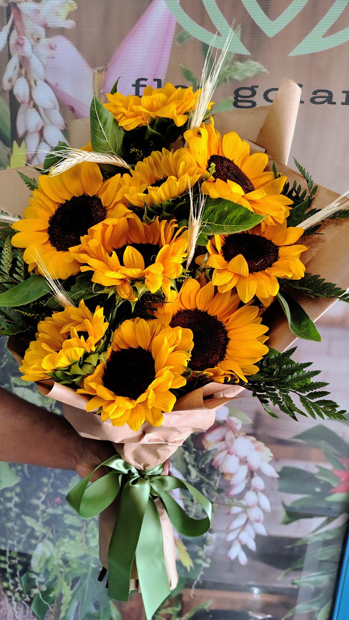 Buquê composto por 10 girassóis envolvido por papel Kraft coreano pronto que mais aqui eu tava rascunho
